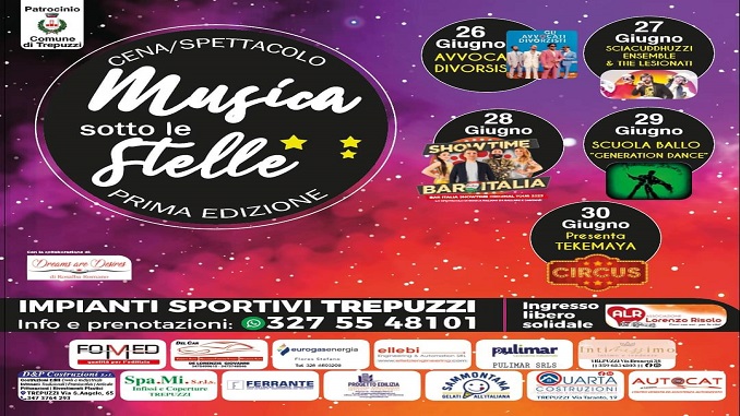 TREPUZZI – Inizia oggi una cinque giorni speciale presso gli impianti sportivi di Trepuzzi. La kermesse, dal titolo “musica sotto le stelle” parte infatti questa sera con gli avvocati divorzisti. Martedì sarà la volta di “sciacuddhuzzi ensemble” insieme ai Lesionati, mercoledì grande show con bar Italia, giovedì spazio alla scuola di ballo generation dance e venerdì gran finale con lo spettacolo Circus diretto da Tekemaia. Ingresso libero solidale: il ricavato sarà devoluto all’associazione Lorenzo Risolo.