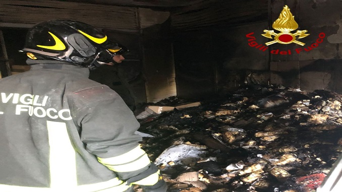 Il rogo, che ha avuto origine nel magazino attiguo alla rivendita rischiava di propagarsi alla merce e i macchinari aziendali.