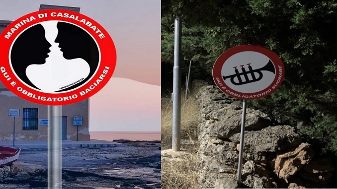 E così al segnale istituzionale che rende “obbligatorio” un bacio vista mare nella zona squinzanese della marina di Casalabate, hanno fatto seguito cartelli installati – ad opera di ignoti – all’estrema periferia di Trepuzzi, nelle zone notoriamente più nascoste, dove al simbolo di una tromba è associata la frase “qui è obbligatorio suonare”.