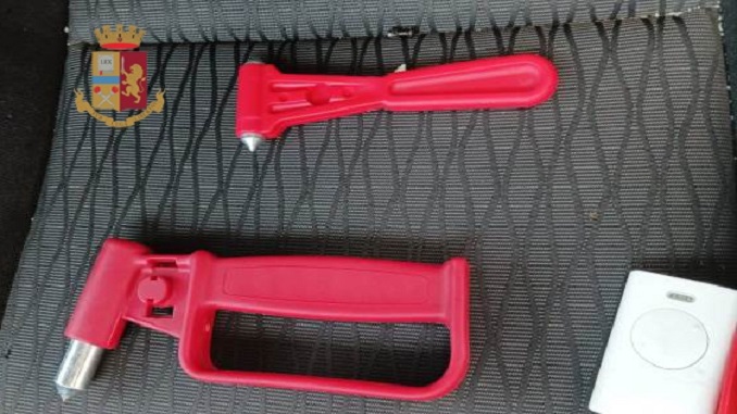 Approfondito il controllo, da uno zaino è emerso un martelletto di emergenza frangivetro con due puntali bilaterali in metallo, di cui i fermati non hanno saputo giustificarne il possesso. Gli oggetti sequestrati, indicati allo scasso, probabilmente, sarebbero stati usati per compiere furti di autovetture.