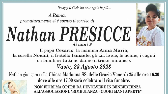 POGGIARDO – Un grande dolore è piombato sulla Comunità di Vaste e Poggiardo: il sorriso di Nathan Presicce, bimbo di appena 9 anni, si è spento prematuramente a Roma, dopo anni di lotta contro una malattia.