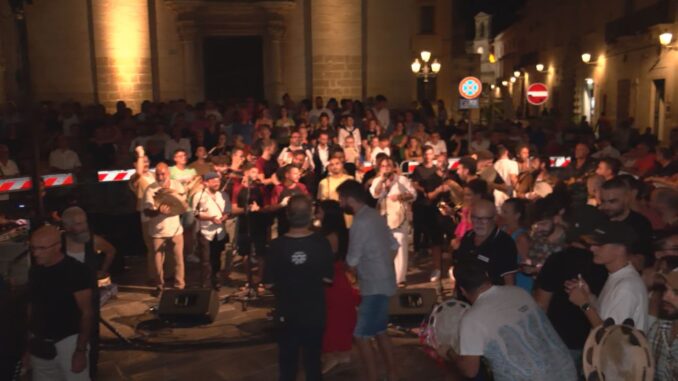 Nella città dove sorge la Cappella di San Paolo e il mito del Tarantismo, 8 ronde hanno prima attraversato le principali vie del centro storico e alle 22, dopo aver suonato separatamente, si sono riunite in pazza San Pietro coinvolgendo l’intero borgo e dando il via alla “maxi-ronda” con 80 musicisti.