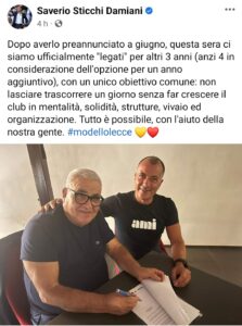E proprio nelle scorse ore, sui suoi profili social, Facebook e Instagram, il presidente del Lecce ha postato una foto e un messaggio: