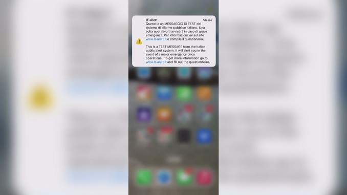 “Questo è un messaggio di test del sistema di allarme pubblico italiano. Una volta operativo ti avviserà in caso di grave emergenza. Per informazioni vai sul sito eww.it-alert.it e compila il questionario. “
