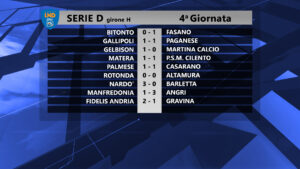 LECCE – In Serie D si è giocata la quarta giornata del girone di andata. Solo il Nardò ha vinto con un secco 3-0 contro il Barletta. Per i granata a segno D’Anna, Ceccarini e Dambros.