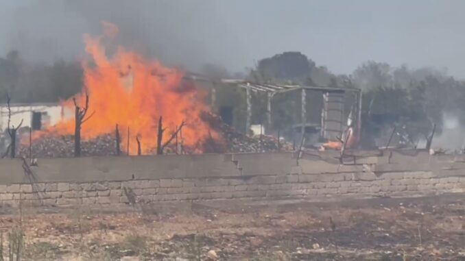 GALATONE – I Vigili del Fuoco di Gallipoli, insieme ad altre squadre di supporto , sono al lavoro nella zona industriale di Galatone per domare un vasto incendio che ha colpito un’zienda edile, la “Ditta Colazzo”. Al momento non è chiaro cosa abbia provocato il rogo che però, con ogni probabilità, si è sviluppato dalle sterpaglie circostanti per poi lambire l’azenda ed infine coinvolgere anche i mezzi pesanti parcheggiati all’interno. Il vento non rende semplici le operazioni di spegnimento. Fortunatamente, il fatto che l’episodio si sia verificato nel pieno di una mattinata di lavoro, ha consentito di allertare immediatamente i soccorsi.  Una densa colonna di fumo ha invaso anche la 101, la Lecce- Gallipoli, proprio all’altezza dello svincolo per Galatone.