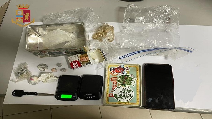 Nel corso della perquisizione estesa all’abitazione del giovane, i poliziotti hanno rinvenuto in camera sua anche una scatola di latta con all’interno del materiale da confezionamento, in parte tagliato, altri involucri in cellophane trasparente con evidenti residui di droga ed un coltellino utilizzato per il frazionamento della sostanza, ancora sporco.