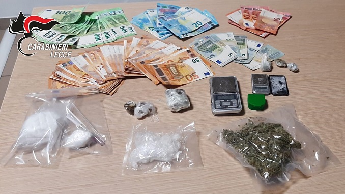 Visto il continuo via vai di giovani, i Carabinieri della locale Stazione unitamente ai colleghi della Sezione Radiomobile di Tricase hanno effettuato una perquisizione domiciliare e personale, a seguito della quale, nell’abitazione è stato ritrovato un contenitore in plastica con all’interno circa 70 grammi cocaina, 60 grammi di hashish e 65 grammi di marijuana. Inoltre sono stati rinvenuti 2 bilancini di precisione, materiale per il confezionamento e 5000 euro in banconote di diverso taglio, presumibile provento di spaccio.