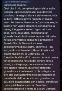 Nel post sul suo canale telegram (riassumiamo) si legge: “quell’acronimo non corrisponde al presidente del Lecce, stimato giurista con cui, oltre alla passione per il calcio, condivido i principi di lealtà sportiva. Smentisco categoricamente il nome di Sticchi Damiani. Mi auguro di trovare sullo stesso giornale identico spazio che mi è stato concesso quando mi è stata attribuita la notizia anche oggi che l’ho smentita, per onestà intellettuale e per rispetto del presidente Saverio Sticchi Damiani”.