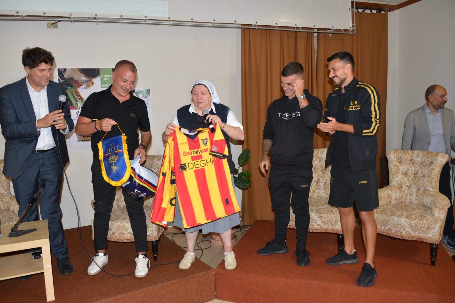 Alla proiezione del video hanno partecipato i calciatori del Lecce Gabriel Strefezza e Nicola Sansone , e il presidente Saverio Sticchi Damiani. “Noi scendiamo in campo ogni giorno, su tutto il territorio, nel sociale e vicino ai ragazzi – ha detto il presidente del club giallorosso -. In questo momento c’è un movimento meraviglioso che coinvolge le nuove generazioni, che si sono innamorate sempre di più della nostra squadra. E di questo sono molto orgoglioso, è una cosa su cui puntavamo tutti noi dirigenti del Lecce”.