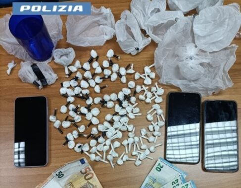 involucri termosaldati contenenti della polvere bianca. Immediato l’intervento dei poliziotti che hanno recuperato l’involucro con all’interno oltre un centinaio di dosi di cocaina per un peso di circa 90 grammi.