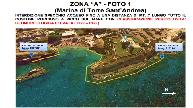 MELENDUGNO – L’Ufficio Circondariale Marittimo di Otranto, tenendo conto del livello di pericolosità geomorfologica del litorale di Melendugno, a causa dello sfaldamento dei costoni rocciosi che possono interessare i prospicienti specchi acquei, ha vietato la navigazione, la sosta e l’ancoraggio di tutte le unità navali in genere; la balneazione e la pesca dai 5 ai 50 metri dalla costa nelle marine di “Torre S. Andrea”, “Torre dell’Orso”, “Roca li Posti” e San Foca. Il Comune di Melendugno, nel cui territorio ricadono le zone di mare e le spiagge, provvederà ad installare idonea cartellonistica per indicare i divieti di imposti.