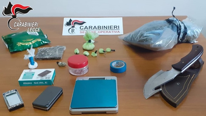 CASARANO – I carabinieri della Compagnia di Casarano durante un posto di blocco hanno fermato un’auto e l’atteggiamento degli occupanti ha destato sospetti, portando i militari a più approfonditi controlli. All’interno dell’abitacolo è stato rinvenuto un coltello di 23 centimetri, e durante la perquisizione domiciliare sono stati rinvenuti circa 250 grammi tra marijuana e hashish, del materiale per il confezionamento e vari bilancini di precisione.