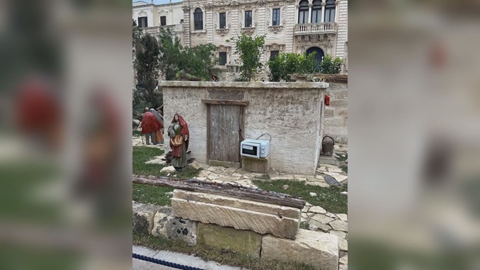 LECCE – Singolare scoperta questa mattina a Lecce. Un forno a microonde, all’interno del quale è stata rinvenuta una foto che ritrae una coppia che si scambiava un bacio, è stato posizionato all’interno del presepe collocato in piazza Duomo.