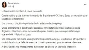 “Esprimo tutta la mia ammirazione per il brigadiere Ivano Grazia , per l’intuito, la prontezza di riflessi e la competenza dimostrata salvando un neonato dal soffocamento. Sono gesti che meritano di essere evidenziati e che segnano indelebilmente la vita propria e quella di chi viene salvato”.