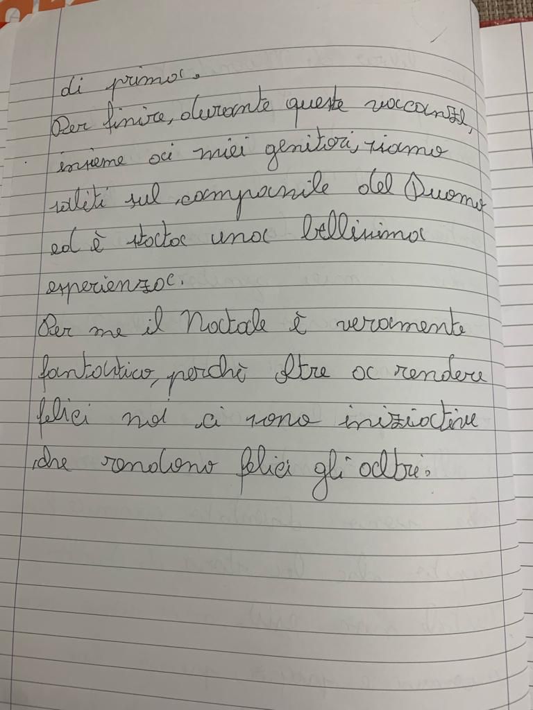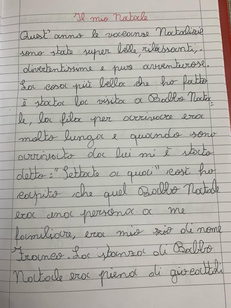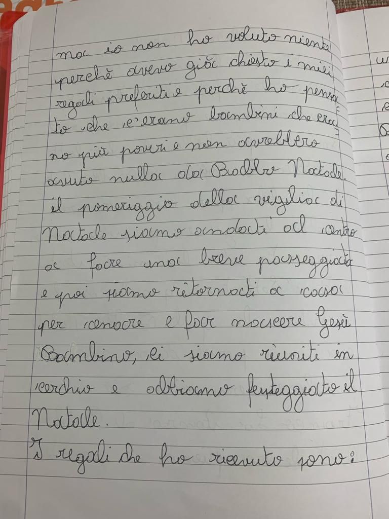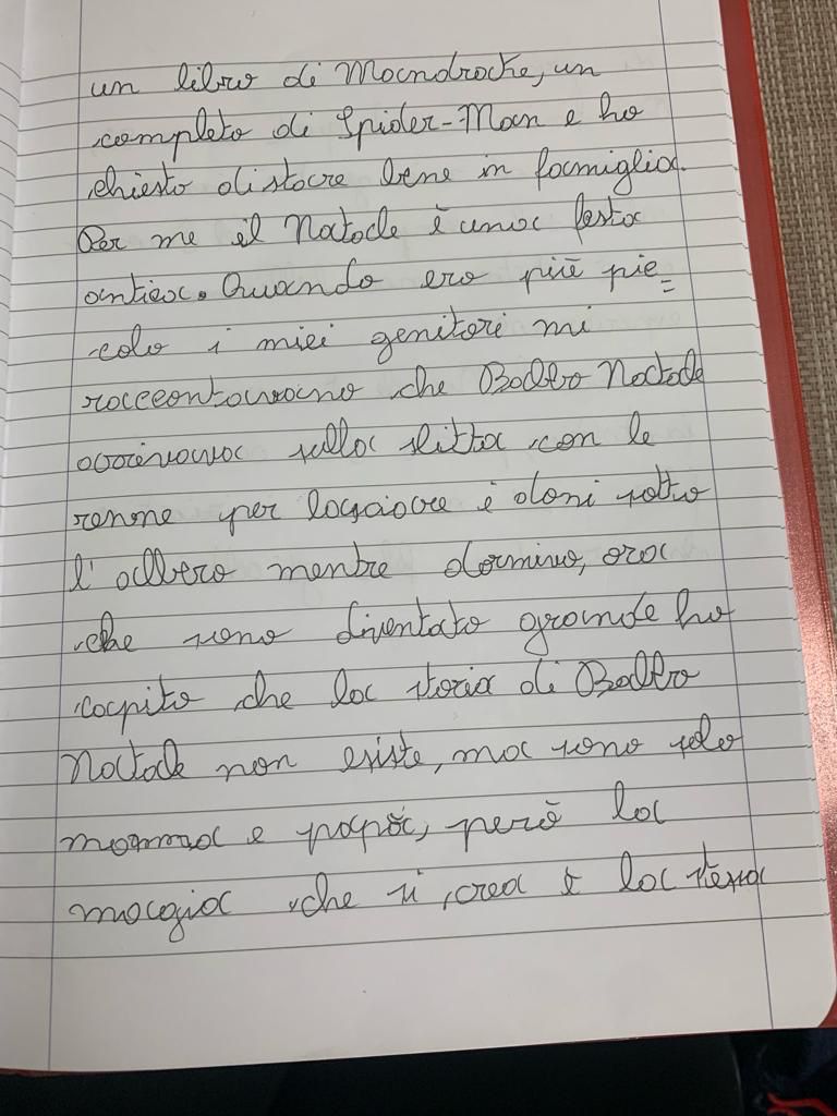 “Si tratta di un alunno  della quarta elementare della scuola San Domenico Savio , che al rientro delle vacanze, ha scritto  il tema -scrive Guido-   in cui  parla di noi, della corte, di Babbo Natale e, soprattutto, della solidarietà e dei buoni propositi.