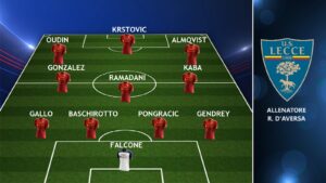 LECCE (4-3-3): Falcone; Gendrey, Pongracic, Baschirotto, Gallo; Kaba, Ramadani, Gonzalez; Almqvist, Krstovic, Oudin. A disposizione: Brancolini, Samooja, Venuti, Dorgu, Berisha, Listkowski, Smajlović, Strefezza, Blin, Piccoli. Allenatore: Roberto D’Aversa