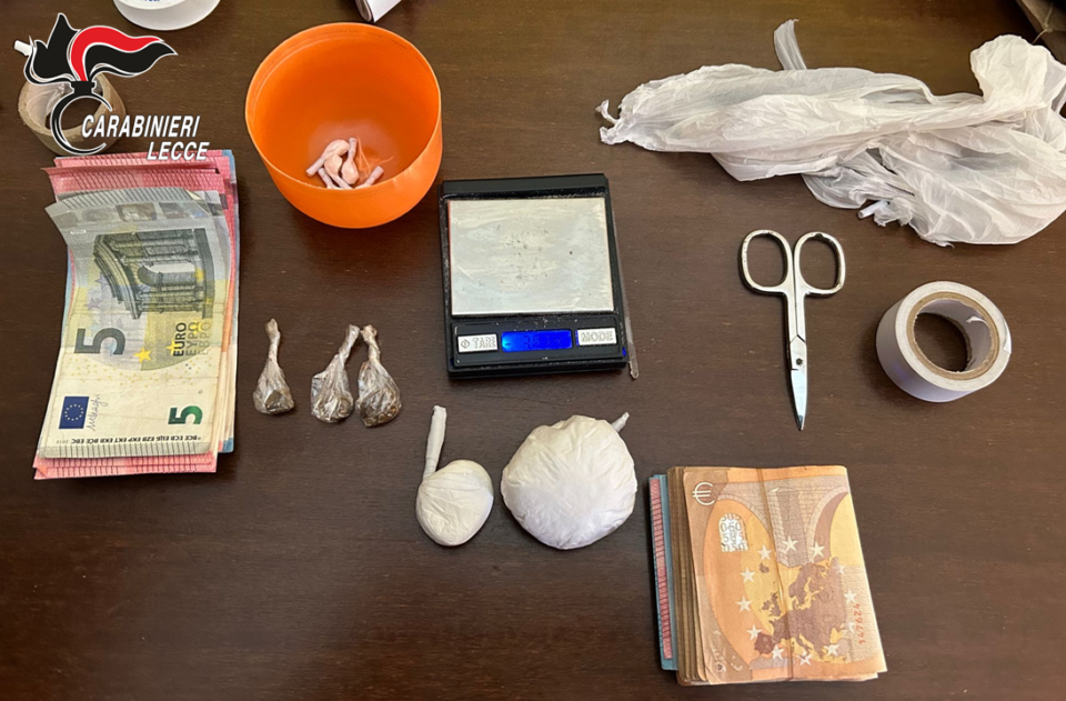 L’arresto scaturisce da una attenta e mirata attività info-investigativa che ha portato i militari sulle tracce del presunto spacciatore nei confronti del quale sono stati svolti idonei servizi di osservazione, pedinamento e controllo sfociati in una perquisizione domiciliare. Nell’attività di ricerca, infallibile è stato il fiuto di “One”, il cane antidroga, che ha consentito di rinvenire all’interno del cassetto di un comodino nella camera da letto, 7 involucri in cellophane contenente sostanza presumibilmente stupefacente del tipo cocaina dal peso complessivo di circa 40 grammi oltre ulteriori 3 involucri in cellophane contenenti sostanza verosimilmente del tipo hashish per un peso complessivo di quasi 2 grammi, accuratamente occultati in un berretto in lana. Nel corso delle operazioni è stato rinvenuto inoltre un bilancino di precisione, materiale vario per il confezionamento oltre alla somma di circa 2000 euro in contanti. Il tutto è stato sottoposto a sequestro a disposizione dell’Autorità Giudiziaria, così come anche il denaro contante ritenuto provento della presunta attività di spaccio. Al termine dell’attività di polizia, il giovane è stato arrestato e come disposto dal P.M. di turno presso la Procura della Repubblica di Lecce che conduce le indagini, è stato sottoposto alla misura cautelare personale degli arresti domiciliari.