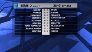 Sabato il Nardò aveva vinto 3-0 contro l’Angri con i gol di De Giorgi (3′), Ciraci (32′) e D’Anna (51′). Oggi il Casarano, al Capozza, ha battuto 2-0 la Paganese con le reti di Corvino (50′) e Perez (74′).