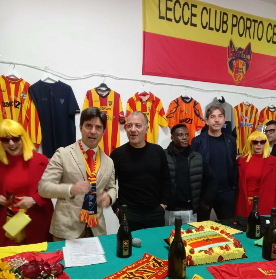 PORTO CESAREO – Taglio del nastro per il Lecce Club di Porto Cesareo in via Beethoven alla presenza del presidente giallorosso Saverio Sticchi Damiani, del diesse Stefano Trinchera e dell’attaccante Lameck Banda.