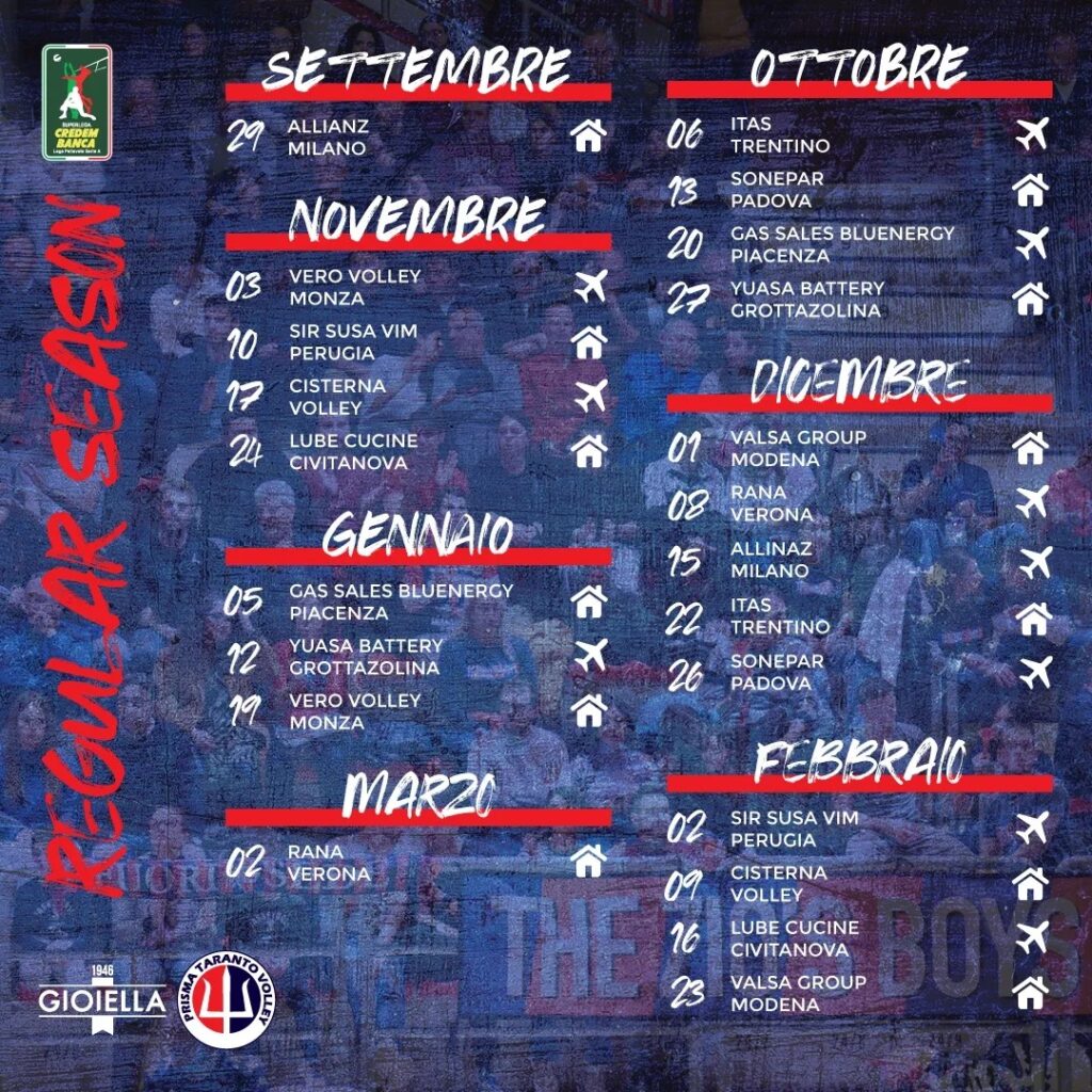Novembre inizia con la trasferta contro il Vero Volley Monza, il 3, seguita da una serie di incontri che vedranno la squadra tarantina giocare contro alcune delle formazioni più forti del campionato, come il Sir Susa Vim Perugia il 10 novembre e il Cucine Lube Civitanova il 24 novembre. A dicembre, il calendario continua con sfide importanti: il primo giorno del mese si giocherà contro il Valsa Group Modena, mentre l’8 dicembre i rossoblù saranno ospiti della Rana Verona, squadra che incontreranno nuovamente nella partita di chiusura della stagione, il 2 marzo 2025. L’anno nuovo porterà ulteriori emozioni con il match di ritorno contro il Gas Sales Bluenergy Piacenza, previsto per il 5 gennaio 2025, seguito da altre sfide cruciali contro Grottazzolina il 12 gennaio e Monza il 19 gennaio. Da segnalare anche gli incontri contro Perugia, in programma per il 2 febbraio, e i Civitanova, il 16 febbraio. La stagione regolare della Prisma Taranto si concluderà con gli ultimi due match di ritorno, con Modena in trasferta il 23 febbraio e infine in casa con Verona il 2 marzo. Non ci saranno turni infrasettimanali. Potrebbero esserci eventuali modifiche per anticipi o posticipi. Inoltre, sono state ufficializzate le date di due importanti eventi del calendario pallavolistico: la Final Four di Supercoppa, che si terrà il 21 e 22 settembre 2024, con la partecipazione di Perugia, Piacenza, Monza e Trento, e la Final Four di Coppa Italia, in programma per il 25 e 26 gennaio 2025. La stagione 2024/2025 della Gioiella Prisma Taranto si preannuncia dunque ricca di sfide con i tifosi pronti a sostenere la squadra in ogni partita, sperando di alzare l’asticella dei successi rispetto allo scorso campionato.