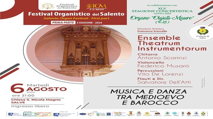SALVE – Il Festival Organistico del Salento fa tappa a Salve. Stasera alle ore 21 nella storica Chiesa di San Nicola Magno, protagonista l‘Ensemble Theatrum Instrumentorum con un programma dal titolo “Musica e danza tra Medioevo e Barocco. Il concerto è l’occasione per riscoprire il fascino della musica del passato, quella degli antichi codici musicali, eseguita nel suo corretto linguaggio. L’ensemble, portando in scena strumenti antichi, propone un repertorio legato all’età degli strumenti, sostenuti dall’Organo Mauro Olgiati del 1628.