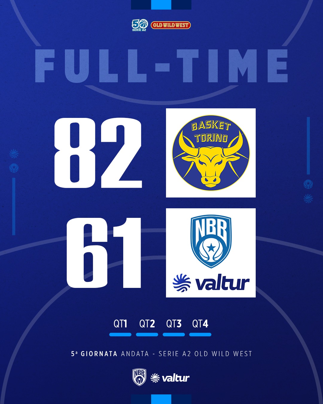 Senza gli infortunati Ogden, Vildera e Ndzie, la Valtur Brindisi crolla al Pala Gianni Asti con Reale Mutua Torino che vince largamente per 82-61 con i parziali di 18-11; 19-14; 26-17; 19-19.