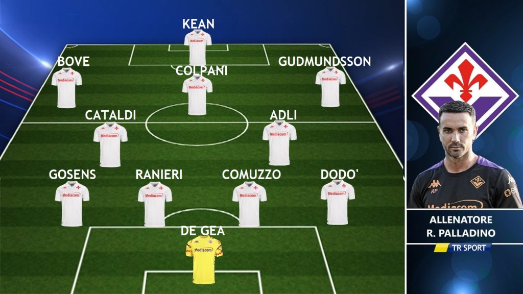 FIORENTINA (4-2-3-1): De Gea; Dodô, Comuzzo, Ranieri ©, Gosens; Adli, Cataldi; Gudmundsson, Colpani, Bove; Kean. Allenatore: Stefano Citterio (Palladino squalificato)