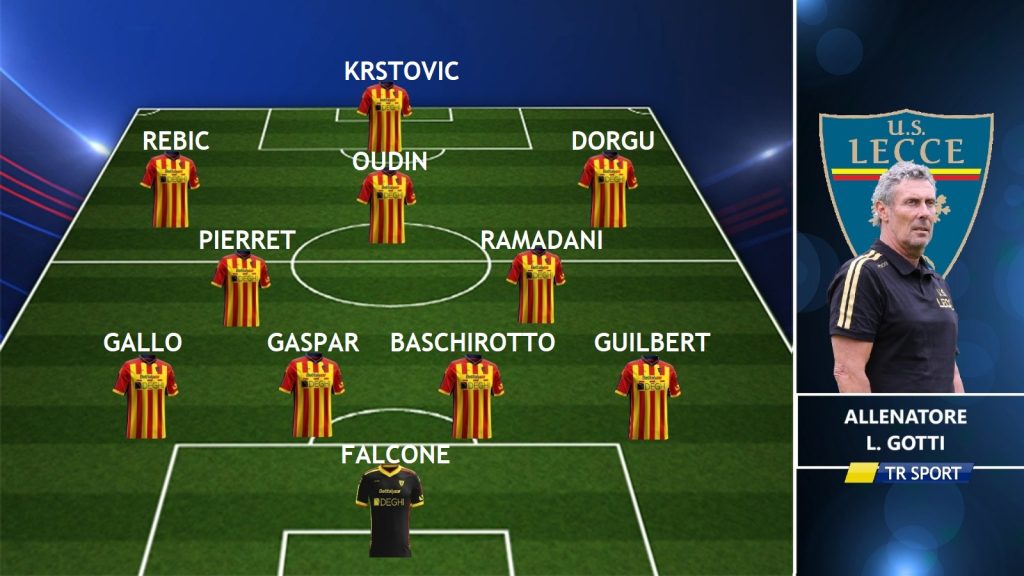 LECCE (4-2-3-1): Falcone; Guilbert, Baschirotto ©, Gaspar; Gallo; Ramadani, Pierret; Dorgu, Oudin, Rebic; Krstovic. Allenatore: Luca Gotti