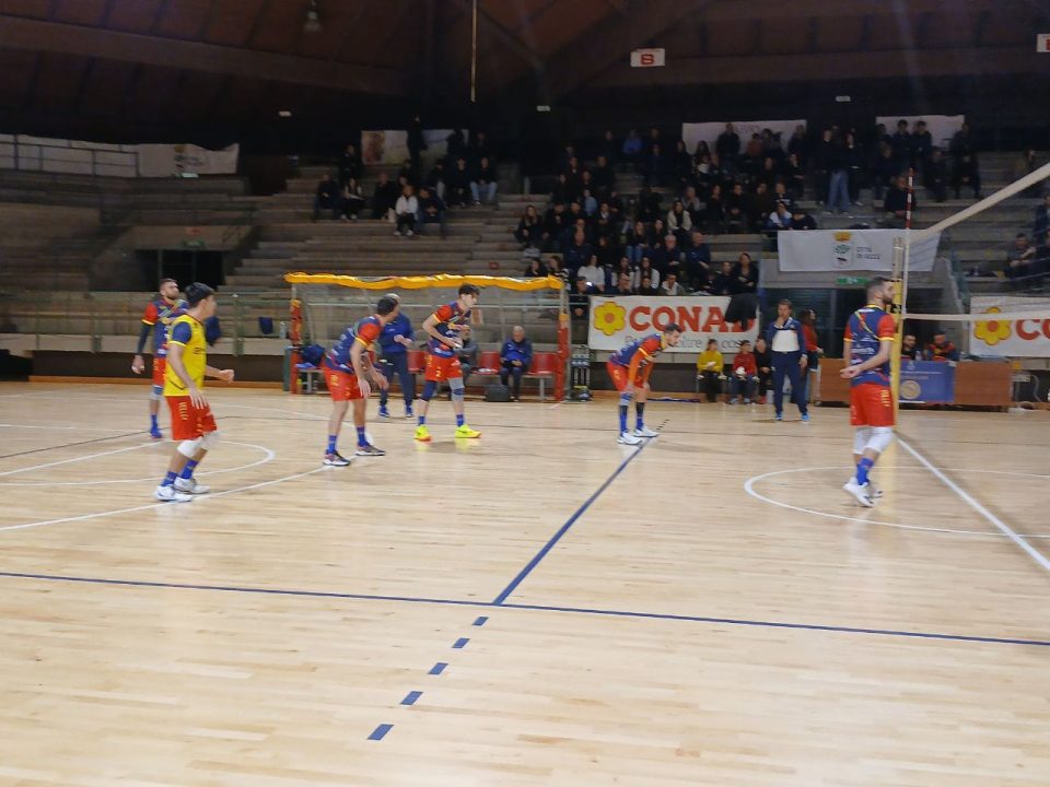 Avvio di primo set incandescente per il vantaggio iniziale dei giallorossi subito aggressivi con Cagnazzo e Tommasi e reattivi in difesa con Di Lecce. La reazione dei padroni di casa non si fa attendere, il regista rossonero si affida ai più efficaci Auriemma e Calabrese spesso bloccati dai master block di Iaccarino molto attento a muro. Il finale di set si accende con le due squadre in perfetto equilibrio ma è Cagnazzo a chiudere il parziale per la Conad con il punteggio di 29 a 27.