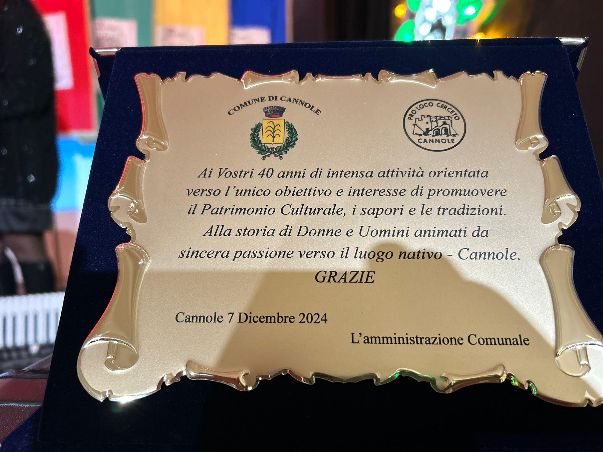 Durante i festeggiamenti per i 40 anni di attività, il sindaco di Cannole, Leandro Rubichi, ha omaggiato la Pro Loco Cerceto con una targa di gratitudine a nome dell’Amministrazione Comunale, riconoscendo il valore e l’impegno dell’associazione nella promozione della cultura e del territorio.