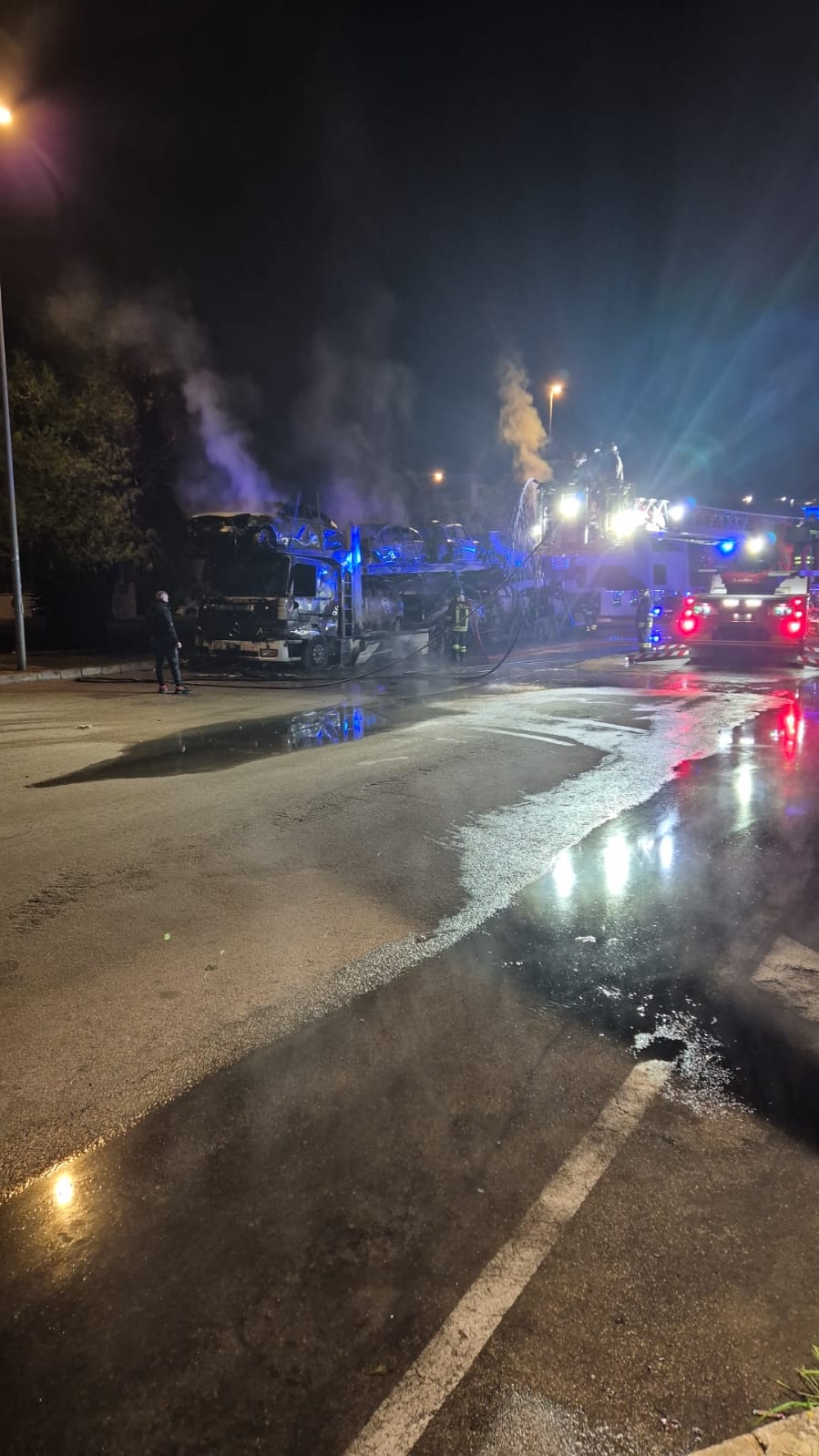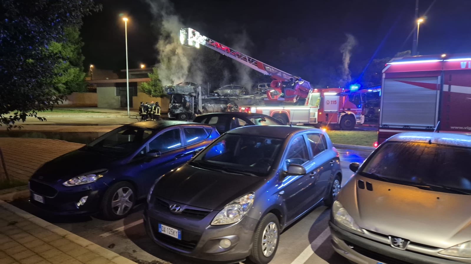 Fiamme nella notte, intorno alle 2, in via Raffaello Sanzio, a Sannicola, nei pressi di largo mercato. Il rogo ha interessato un autocarro Mercedes Actros che trasportava nove autovetture.