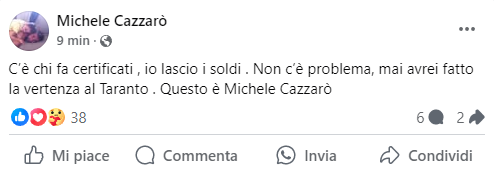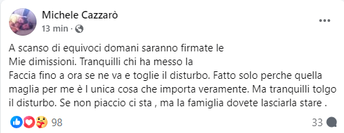 LECCE – Il tecnico del Taranto Michele Cazzarò ha confermato sul proprio profilo facebook che domani firmerà le proprie dimissioni.