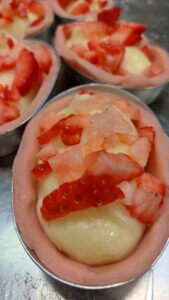 Il fruttone rosa è composto da frolla rosa al profumo di lamponi all’interno della quale è racchiuso uno strato di confettura alla fragola e pan di spagna aromatizzato al limone e un secondo strato di pasta di mandorla. Il tutto ricoperto da cioccolato rosa. Ne saranno prodotti mille pezzi per l’occasione che verranno offerti il 13 maggio in uno dei villaggi che saranno allestiti nelle due piazze principali della città.
