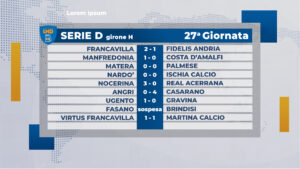 LECCE – In Serie D si è giocata la 27^ giornata di campionato. Il Casarano sempre in vetta alla classifica grazie al poker rifilato all’Angri, in trasferta. I gol rossazzurri sono stati segnati da  Ferrara (3′),  Loiodice (11′), Cassese (15′ aut.) e Malcore (31′): pratica chiusa già nel primo tempo.