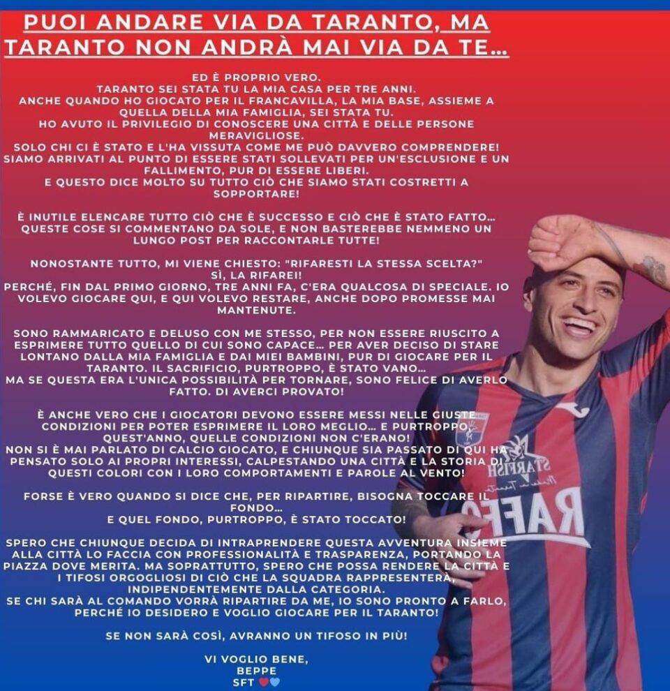 TARANTO – Giuseppe Giovinco, ex calciatore e ora appassionato tifoso del Taranto, ha espresso il suo desiderio di tornare a giocare per la squadra della sua città. In un post su Instagram, il centrocampista ha dichiarato di essere pronto ad unirsi al club, qualora la futura dirigenza lo desideri. Un gesto che sottolinea la sua affezione verso la squadra, ma che, nel caso non dovesse concretizzarsi, non gli impedirebbe di continuare a sostenere la squadra da tifoso.