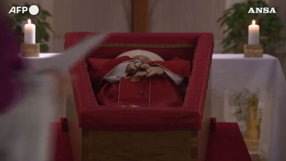 È cosi che è stato esposto il feretro di Papa Francesco nella cappella di Casa Santa Marta, rispettando le sue volontà di una cerimonia sobria. Da qui, alle nove di mercoledì la salma del Pontefice sarà trasferita processionalmente nella Basilica di San Pietro dove, presso l’altare della confessione, il cardinale camerlengo Farewell presiederà la Liturgia della Parola, al termine della quale avranno inizio le visite alla salma del Romano Pontefice. Sabato è il giorno del funerale in Piazza San Pietro.