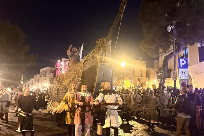 Grande festa di fede e di popolo, a Bari, per la tre giorni in onore del patrono San Nicola. Folla di baresi e turisti per assistere alla Caravella, rievocazione storica della “mirabile impresa” compiuta dai 62 marinai baresi che, nel 1087, traslarono le ossa del santo di Myra. Sotto la direzione artistica di Gianni Ciardo, il corteo è partito dal Castello Svevo per sfilare lungo corso Vittorio Emanuele tra due ali di pubblico e di fedeli. Ben 650 figuranti impegnati, il ritorno dei cavalli e la tappa finale dinanzi alla Basilica con la performance musicale di Antonella Ruggiero, accompagnata dallo spettacolo di danza aerea di Elisa Barucchieri. Grandi suggestioni, a cui si aggiungeranno le luminarie di piazza del Ferrarese. L’accensione, la sera dell’8 maggio, accoglierà la statua del santo patrono in processione, dopo lo sbarco al molo San Nicola previsto per le 20. Allestimento scenografico con 72mila lampadine a led affidato alla ditta Paulicelli, per dare luce alla festa tanto attesa dai devoti di San Nicola, il santo che unisce Oriente e Occidente.