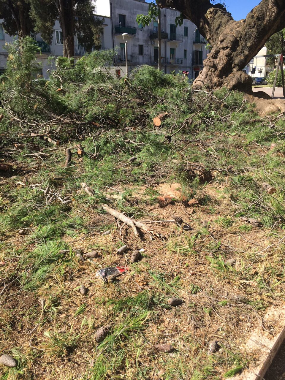 Intanto la piazzetta, mèta preferita di anziani in cerca di riparo dal sole e dalla calura estiva e di bambini che scorazzano liberamente divertendosi con i giochini posizionati sulla piazzetta, anche se questa altalena è in attesa da una vita dei seggiolini, si ritrova ora più spoglia, con meno ombra e meno ossigeno.