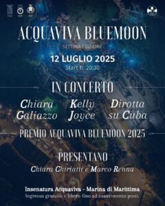 L’invito è a non mancare: 12 luglio 2025, ore 20:30 – Acquaviva BlueMoon, Marina di Marittima. Un appuntamento da segnare in agenda, per lasciarsi trasportare dalla magia di una notte che promette di restare nel cuore.