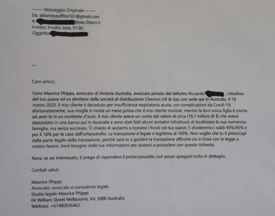 Tutto comincia con una PEC da uno studio legale di Melbourne propone a un cittadino del posto di incassare 18,7 milioni di dollari australiani, eredità di un lontano parente morto di Covid. Il defunto, dicono, non ha eredi diretti e guarda caso ha lo stesso cognome del destinatario.