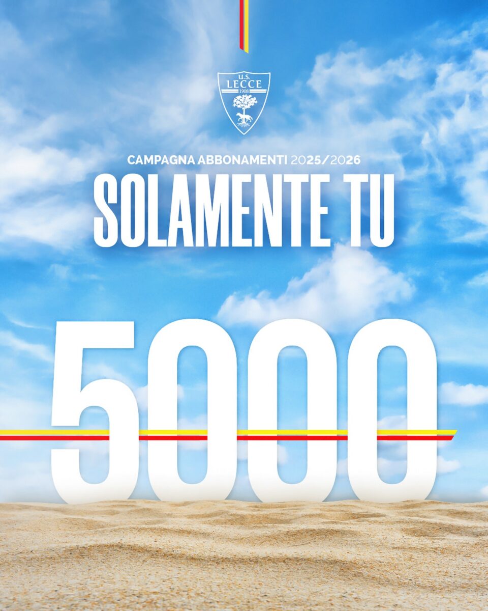 LECCE – Prosegue spedita la campagna abbonamenti del Lecce. Se i dati delle primissime ore tendevano ad essere ottimisti, la conferma arriva dopo appena sei giorni dall’apertura ufficiale della campagna “Solamente tu”. E’ stata infatti superata quota 5000 sottoscrizioni. Lo stesso dato, nella precedente stagione, venne registrato dopo 11 giorni.