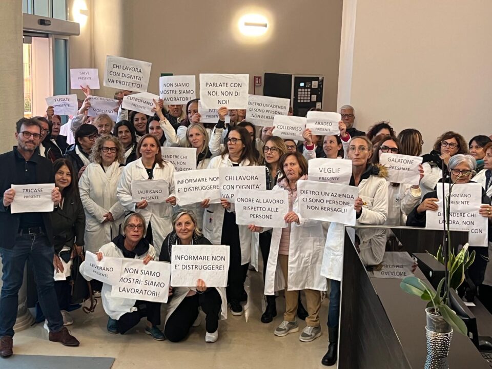 Ieri i dipendenti, con cartelli al seguito, hanno protestato nella sede di Galatone. Una manifestazione per ribadire a gran voce l’innocenza dei lavoratori che, adesso, alla luce delle rescissioni dei contratti effettuate dalla gran parte dei Comuni, temono per il proprio futuro.