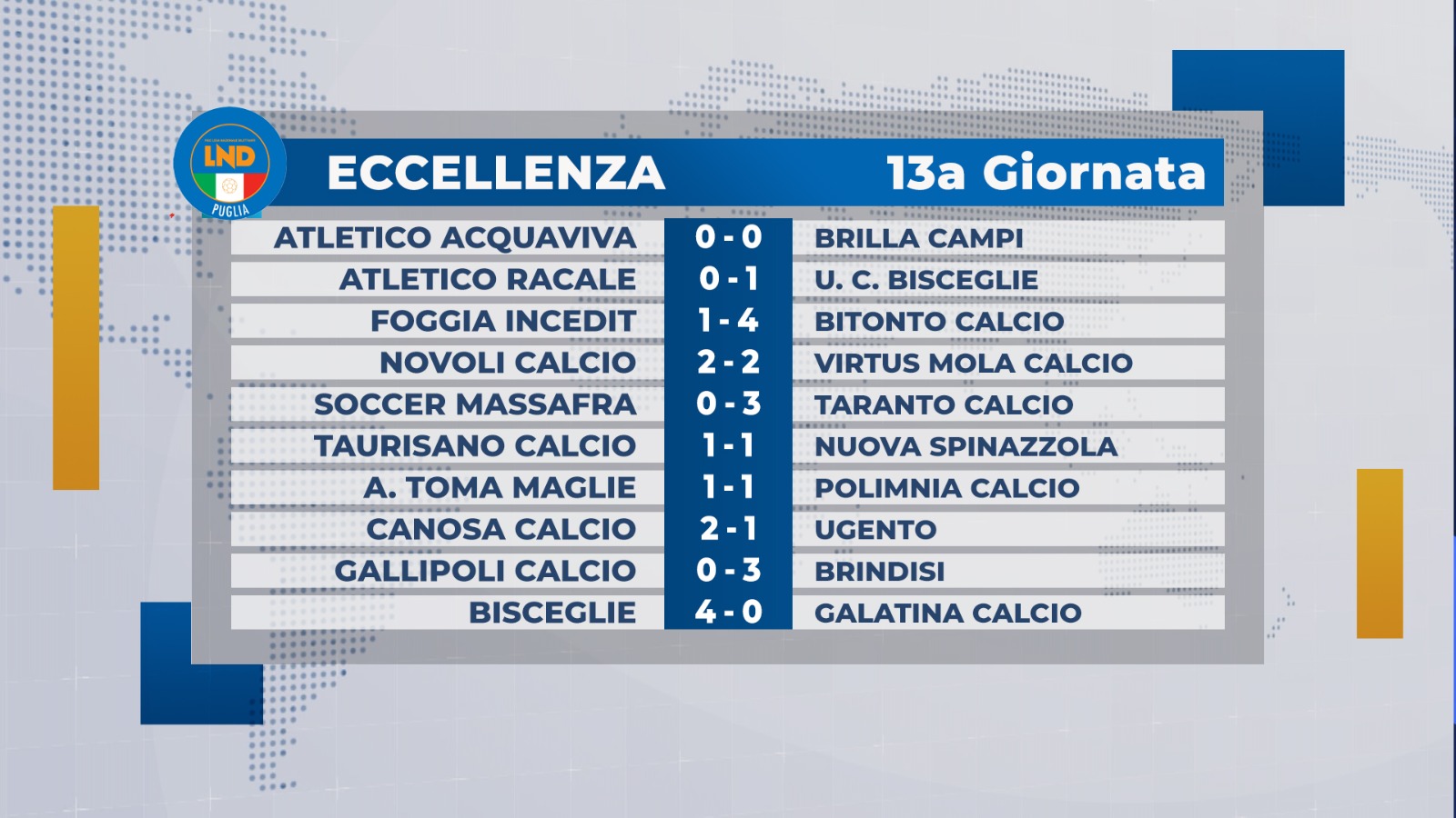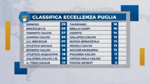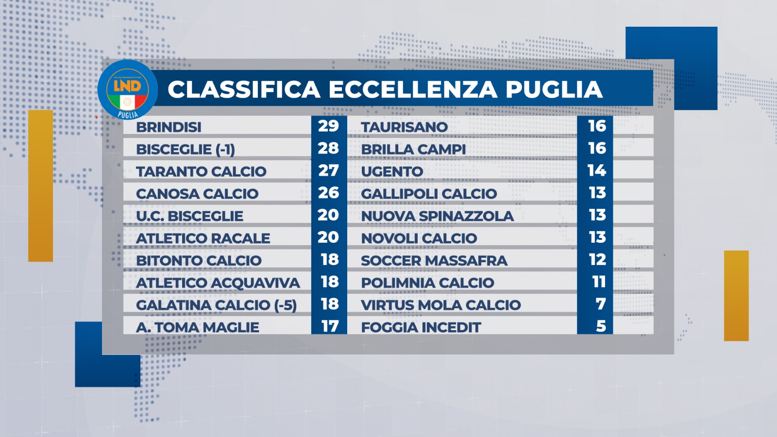 LECCE – Si è giocato il turno infrasettimanale in Eccellenza Pugliese valevole per il tredicesimo turno. Il Brindisi conserva la vetta della classifica grazie al netto successo in casa del Gallipoli.