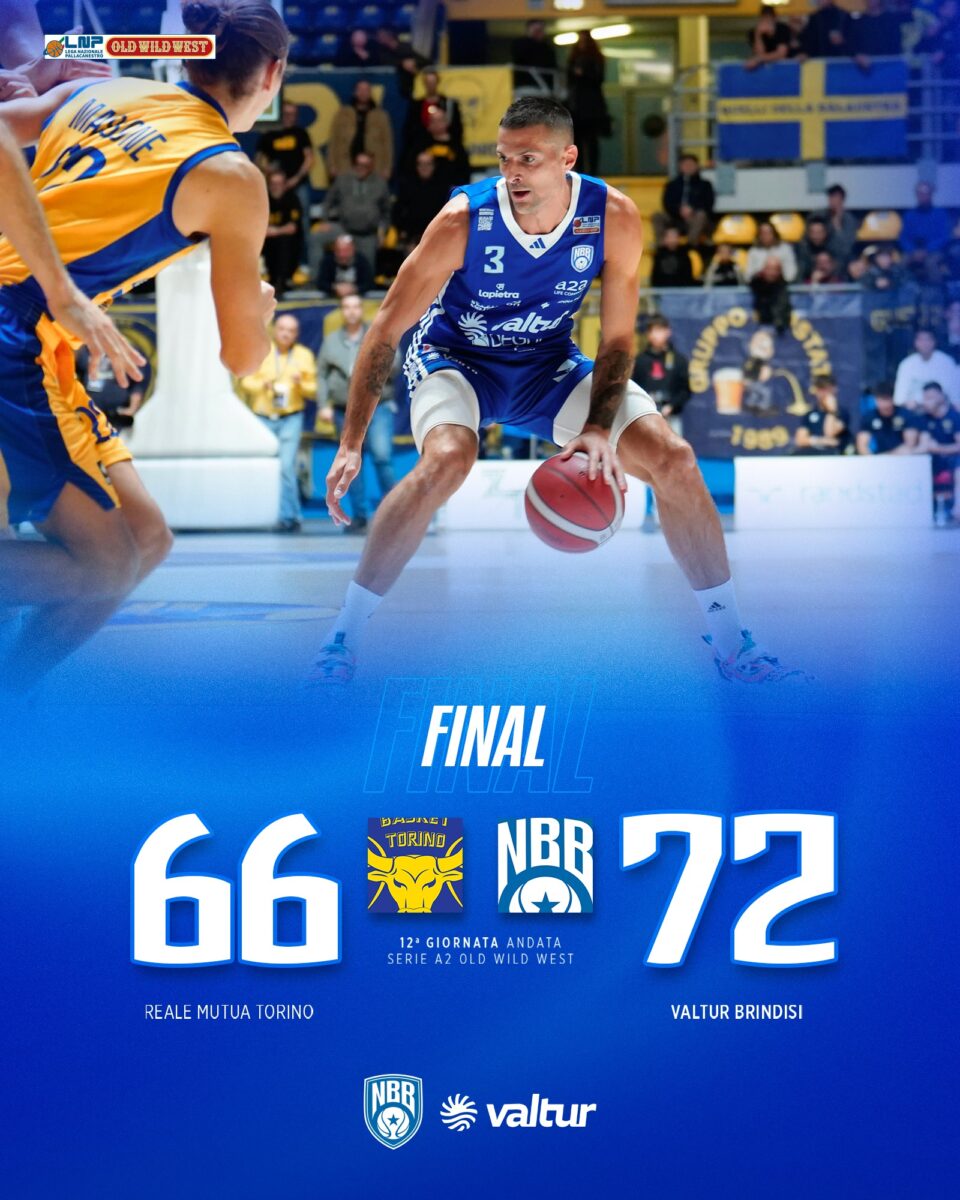 BRINDISI – Nella Serie A2 di basket Valtur Brindisi ha vinto in trasferta in casa di Reale Mutua Torino con il punteggio di 72-66. Questi i parziali: 10-17, 12-22, 16-16, 28-17. La squadra di coach Bucchi è nel gruppone di seconde con 16 punti a quattro lunghezze dalla prima in classifica, Pesaro. I pugliesi hanno replicato ciò che avevano già fatto vedere nel loro ultimo successo: ordine in attacco, precisione degli esterni, dominio mentale. Il Torino invece incassa il quinto stop consecutivo in campionato.