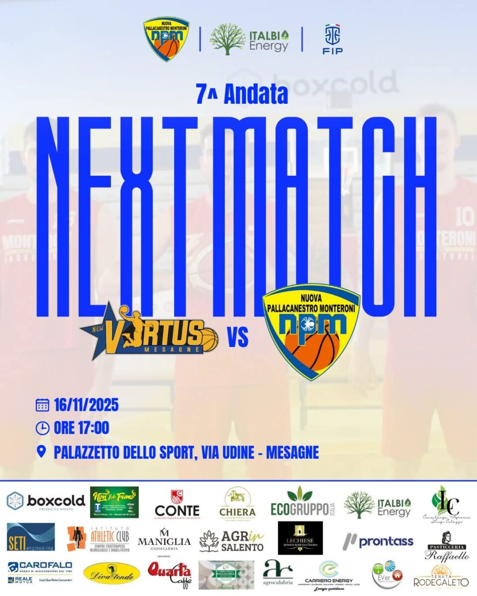 SPORT – Settima giornata oggi del campionato di serie C Pugliese di basket maschile: la New Virtus Mesagne ospiterà la ItalBio Energy NP Monteroni.
