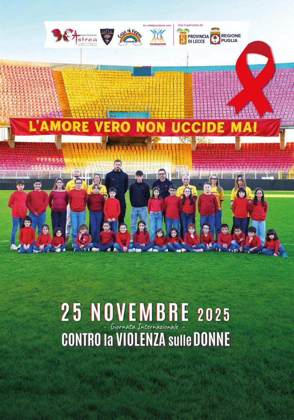 LECCE – “L’Amore vero non uccide mai”. Questo il messaggio della campagna di sensibilizzazione che a partire da oggi – vigilia della Giornata internazionale per l’eliminazione della violenza sulle donne – sara’ veicolato attraverso un manifesto dall’associazione Astrea, dall’associazione Casa di Noemi e dall’Unione Sportiva Lecce. Il manifesto e’ stato realizzato con la partecipazione dei bambini, del capitano del Lecce, Wladimiro Falcone, del mister Eusebio Di Francesco e dei familiari delle vittime, per ricordare Noemi Durini, Raffaella Presta, Donatella Miccoli, Teresa Russo, Michelle Causo, Federica De Luca, il piccolo Andrea e tutte le donne uccise da chi diceva di amarle: il segno rosso dipinto sul volto rappresenta non solo un simbolo, ma testimonia la volonta’ di mantenere alta l’attenzione su un fenomeno drammatico ed e’ un modo per esprimere unione, sostegno e solidarieta’ nella lotta contro la violenza di genere. La campagna di sensibilizzazione – spiegano gli ideatori – nasce per tenere vivo il ricordo delle vittime e per “sostenere le battaglie di familiari-coraggio che vivono il ‘vero ergastolo’ del dolore e che con dignita’ e sofferenza, dovuta ad una perdita impossibile da comprendere, continuano a raccontare le storie delle loro figlie, sorelle, mamme e nipoti. Familiari che hanno trasformato il loro dolore in forza per sensibilizzare, soprattutto i ragazzi, al rispetto e all’idea, appunto, che l’Amore vero non uccide mai”. Grazie alla collaborazione dell’Unione Sportiva Lecce, il messaggio arrivera’ forte ad un ampio pubblico invitandolo a riflettere sul triste fenomeno della violenza sulle donne. “Abbiamo voluto lanciare un messaggio forte e inclusivo – spiega la Presidente dell’associazione Astrea, Valentina Presicce – Non dobbiamo abituarci all’orrore dei femminicidi, la morte di una donna e’ una sconfitta per tutti ed e’ inaccettabile in un Paese civile” .