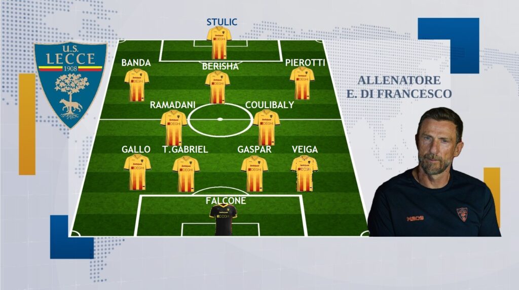 Lecce (4-2-3-1): Falcone; Veiga, Gaspar, Tiago Gabriel, Gallo; Coulibaly, Ramadani; Pierotti, Berisha, Sottil; Stulic. A disp. Fruchtl, Samooja, Ndaba, Siebert, Kouassi, Perez, Sala, Helgason, Kaba, Maleh, N’Dri, Banda, Tete Morente, Camarda. All. Di Francesco.