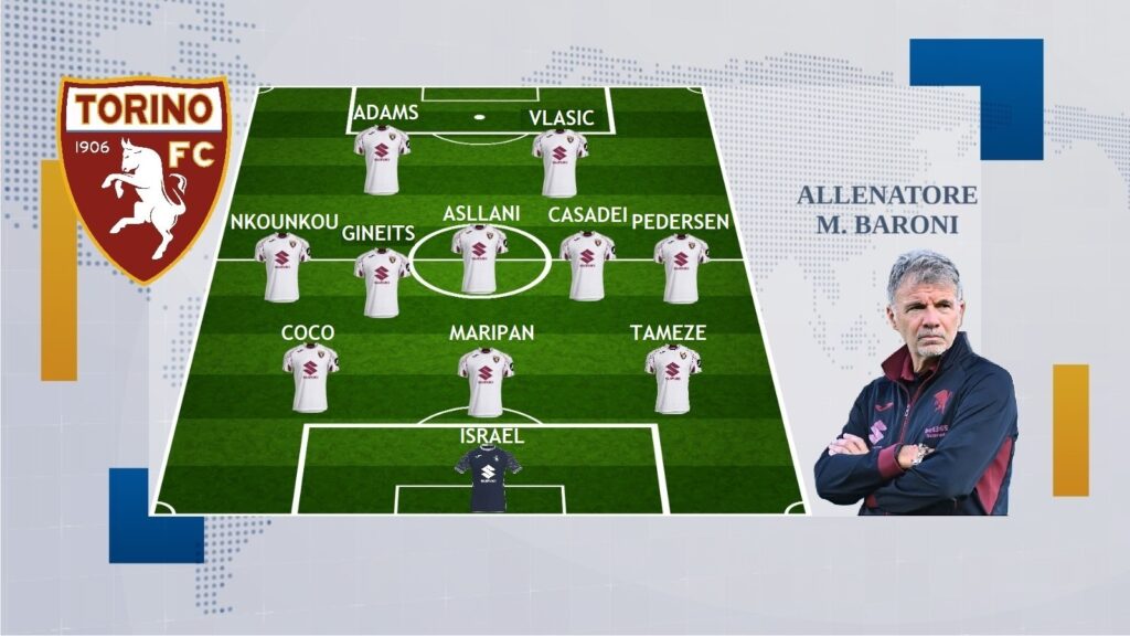 Torino (3-5-2): Israel; Tameze, Maripan, Coco; Pedersen, Casadei, Asllani, Gineitis, Nkounkou; Vlasic, Adams. A disp. Paleari, Popa, Masina, Dembele, Lazaro, Ngonge, Ilkhan, Anjorin, Aboukhlal, Zapata. All. Baroni.