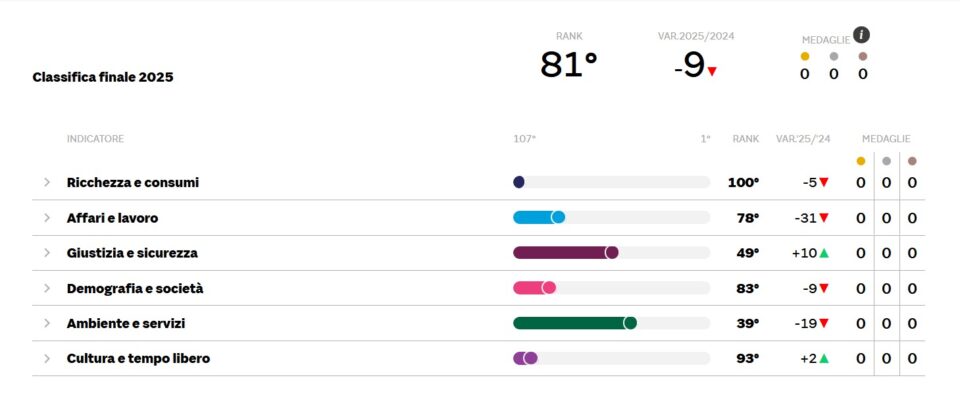 Lecce si colloca all’81° posto nella classifica nazionale sulla qualità della vita 2025 elaborata dal Sole 24 Ore, perdendo nove posizioni rispetto all’anno precedente. Un dato che racconta un territorio in trasformazione, dove emergono eccellenze in termini ambientali e criticità strutturali ancora irrisolte.